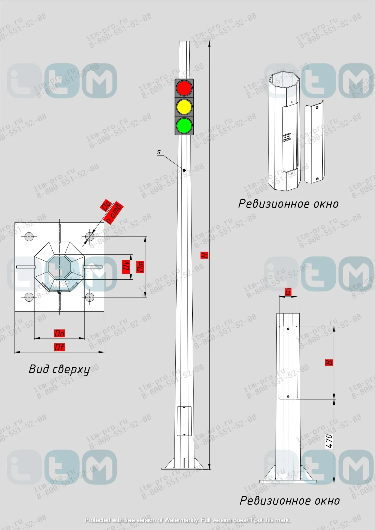 Светофорная опора ОСФГ имеет фланцевое основание, внизу стойки расположен лючок, который позволяет обслуживать место подключения питающего кабеля, который проводится внутри ствола опоры.